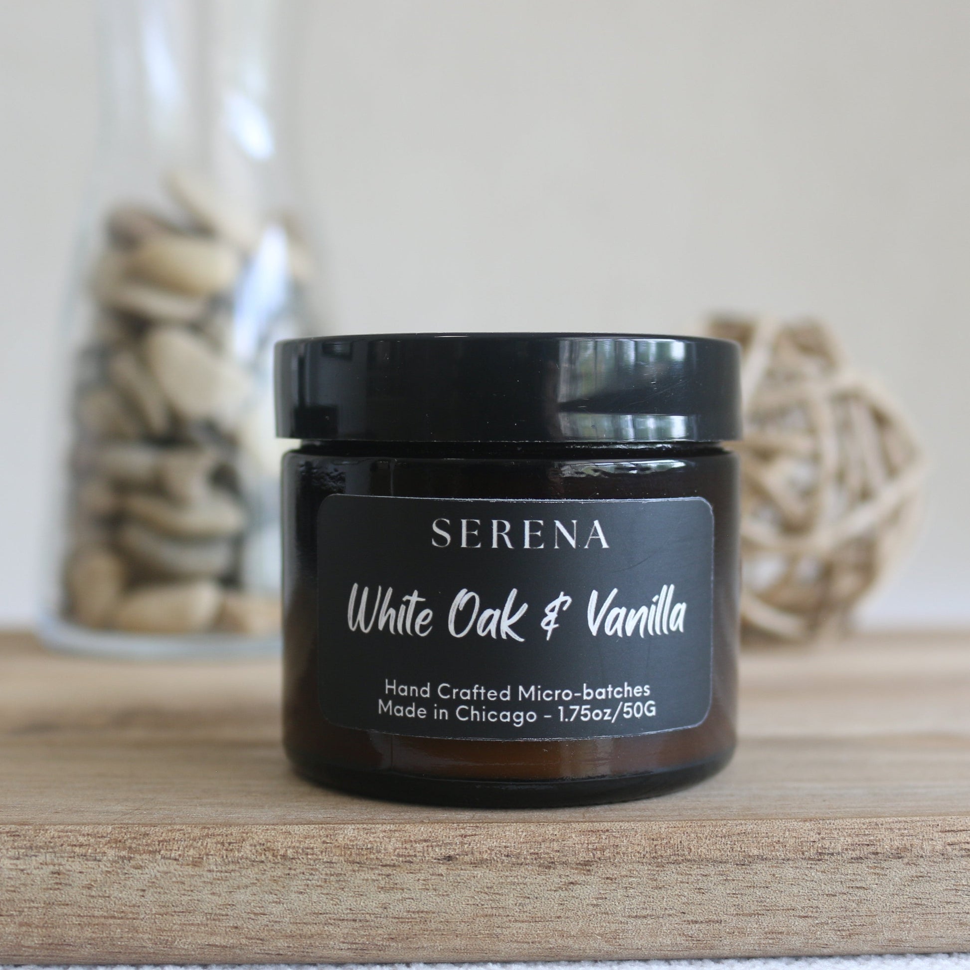 Our White Oak and Vanilla scent culminates in a warm, intoxicating base of smoky notes, enhanced by the creamy sweetness of vanilla and the bold richness of whiskey. Infused with natural essential oils like cassia leaf, clove leaf, ginger root, and grape leaf, this fragrance will transform any space into a cozy haven. Allow White Oak and Vanilla to ground you in comfort and invite a sense of luxury into your home.
